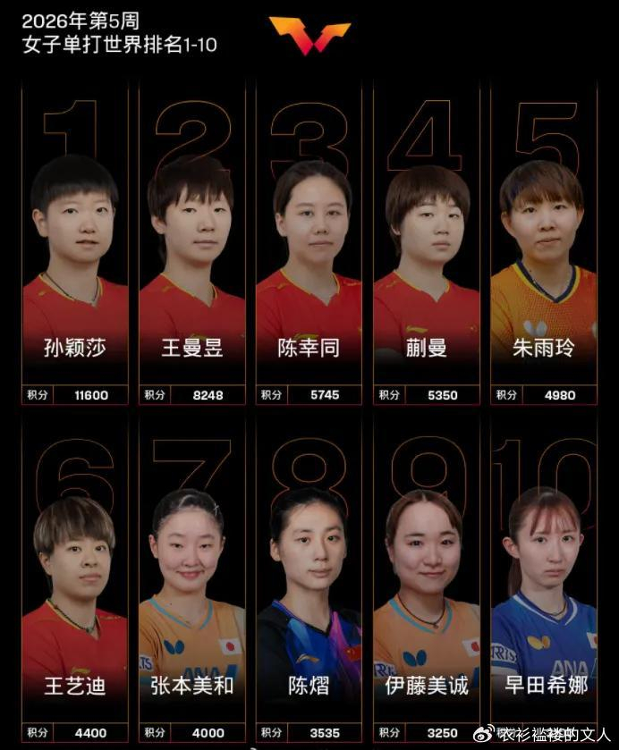 女单的世界排名是这样的。第一名,孙颖莎,积分为11600分;第二名,王曼昱积分为8248分;第三名,陈幸同,积分为5745分;第四名,蒯曼,积分为5350分;第五名,朱雨玲,积分为4980分;第六名,王艺迪,积分为4400分;第七名,张本美和,积分为4000分;第八名,陈熠,积分为3535分;第九名,伊藤美诚,积分为3250分;第十名,早田希娜,积分为3100分。其他国乒球员的情况:石洵瑶第13、何卓佳第27、覃予萱第38、钱天一第42、纵歌曼第44、王晓彤第49。