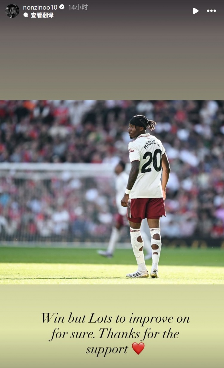 本场比赛阿森纳新援马杜埃凯替补登场,赛后他也在个人社媒晒出本场照片,配文写道:“虽然取得胜利,但是未来还有很多地方需要提升,感谢大家的支持!”